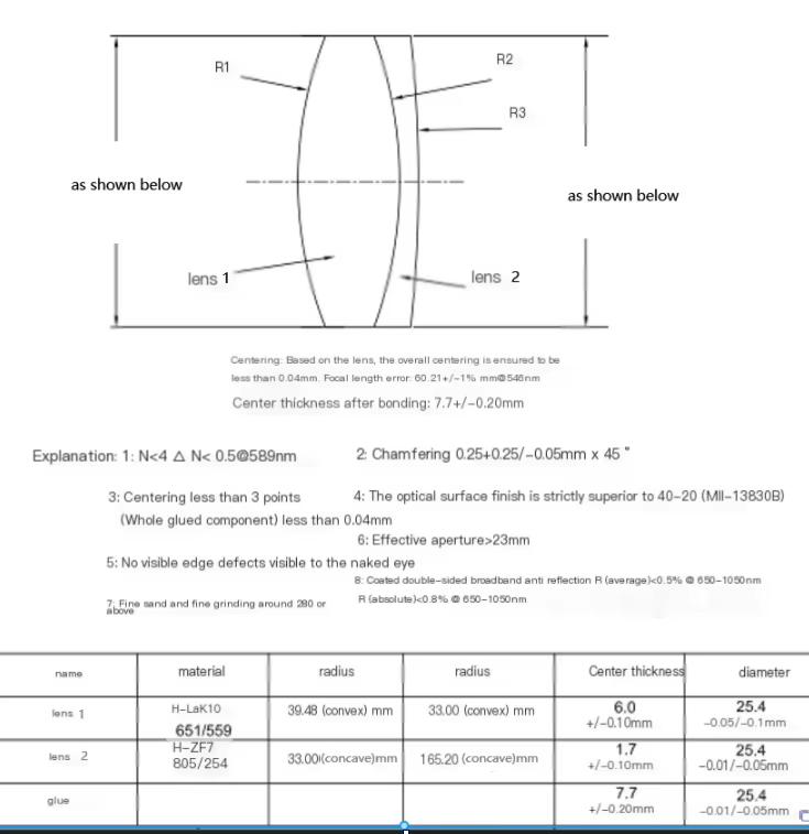 Judging by the geometry, this seems to be a clone of ThorLabs AC254-060-B-ML with what are probably functionally equivalent but differently named materials.*At this point, I should have been paying slightly more attention: although the focal length is specified at 546nm, the antireflective coating is optimized for 650nm to 1050nm. The AliExpress listing discloses this as well, but I must have overlooked it, probably because the 50mm doublet from the same listing is coated for visible light. This will come up to bite me later.