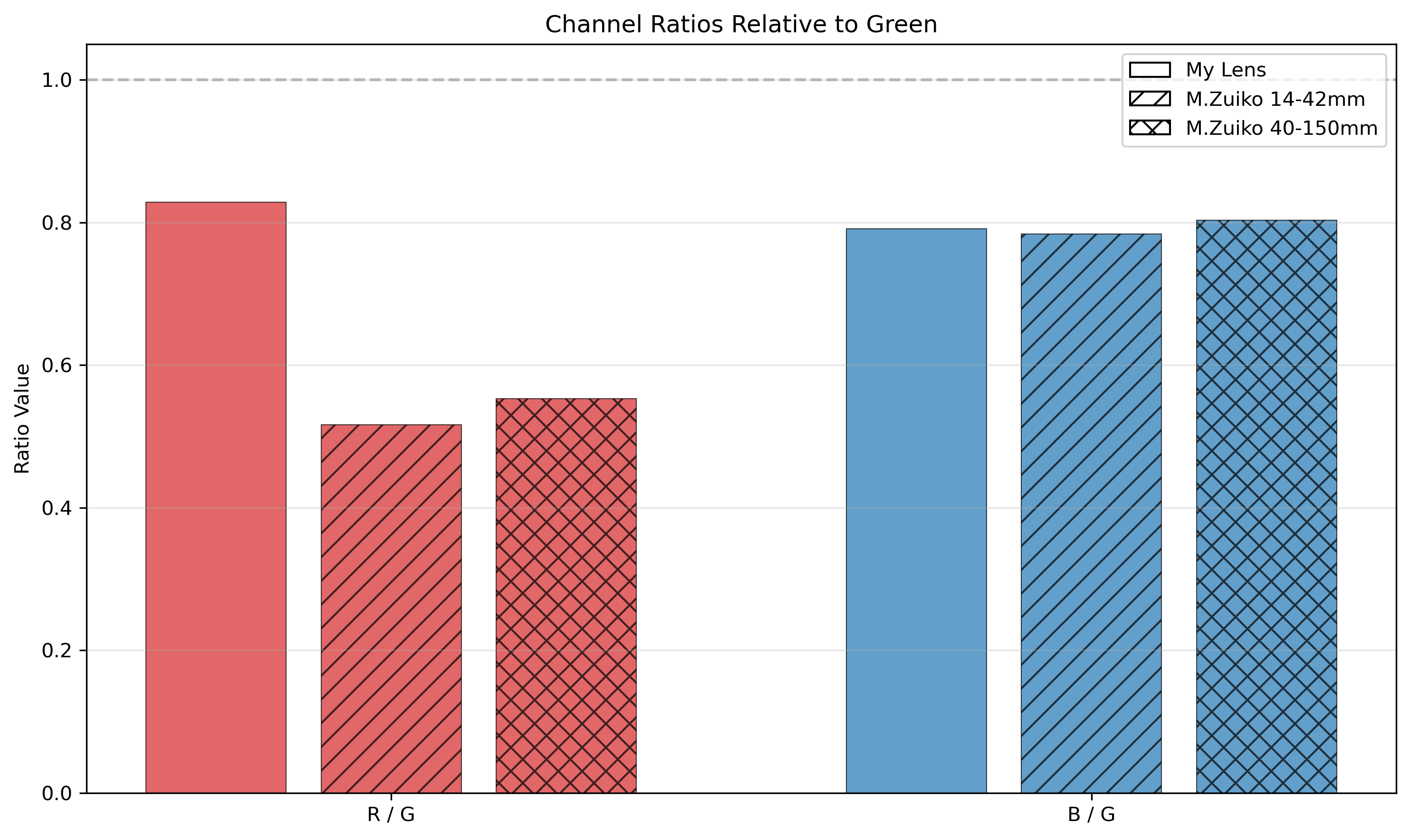 I have already observed that the color rendering is wacky. To quantify this, I photographed a sheet of white paper under daylight with my lens and two commercial lenses and then compared the mean raw pixel values, normalizing to the green channel.